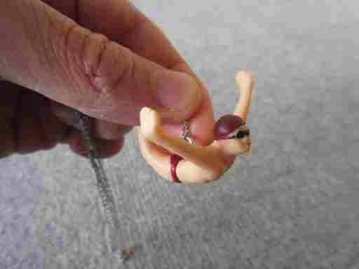 この流れを汲む、「男の浪漫コレクション」なるシリーズがあるんです。その中の新作、その名も「タニマダイバー」をご紹介します。 写真を見てください。一見、水泳パンツで飛び込む男、スカイダイビングをする男、潜水する男のフィギアですけど・・・鎖が付いてますよね。単にフィギアじゃないのです。