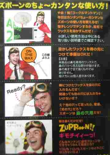 要するに、固形物をチンして粘土みたいに柔らかくしてから鼻の中に突っ込む。まるで、「チョッパチャップス」っすね。 すると、中の粘土が鼻毛と一緒に固まる。そして、えい!と掛け声の元、一気に引き抜く。もうね、一網打尽!!