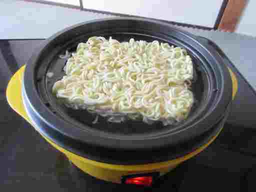 中華麺の名店「日高屋」の”中華そば”なんて390円ですから、私なんか「だったら、日高屋に入るわ!」と心の中で突っ込んだりします。カップラーメンはイオン系では1個80円台で買えますが、それよりも、袋乾麺ならば、1個50円前後ととても割安です。 しかしながら、後者の場合、ネックは鍋に火をかけて鍋を監視しなければならないということです。カップラーメンならばお湯さえ沸かしておけば、手元でじっと3分待っていれば大丈夫ですが、袋乾麺は、キッチンに立たないといけない。激安の分、肉体労働でトントン。 ちなみに、インスタント袋乾麺の場合は、周りに人がいたら、具を別に作って、きちんとラーメンどんぶりに移してお上品に食べますが、一人だったら、もちろん具も作らず、素うどんならぬ素ラーメン、ほんで、どんぶり洗うのがもったいないので、鍋のままで食べます。ん?食べますよね。あれ?鍋のまま食べますよね。 しかも、私は、テーブルまで持って行かずに、キッチンドランカーならぬ、シンクで鍋から直接すすります。 そんな痴話事はその辺にしまして、肉体作業の紛らわしさを払拭させるのが、専用電気鍋です。なにせ、テレビを観ながら手元でラーメンが作れる訳ですから。 ところで、株式会社ピーナッツ・クラブという会社をご存じでしょうか。独身貴族には欠かせない会社でして、「一人用○○」という、電気製品を数多く世に出してる会社です。 「一人用炊飯器」「一人用フライヤー」「一人用焼き鳥器」「一人用焼き肉グリル」「一人用流しそうめん」・・・枚挙にいとまがありません。 株式会社ピーナッツ・クラブさんに他ならず、世の中にはいろんな一人用調理器がありますが、今回ご紹介するアイテムは、インスタント袋乾麺に特化したピーナッツ・クラブの電気鍋、「卓上ラーメンメーカー」をご紹介します。しかも、ななんと、1980円の品なのにフッ素加工鍋・・・・うれしい!! この手のひらサンズのコンパクトさ。生理的に落ち着くぅぅぅ〜。