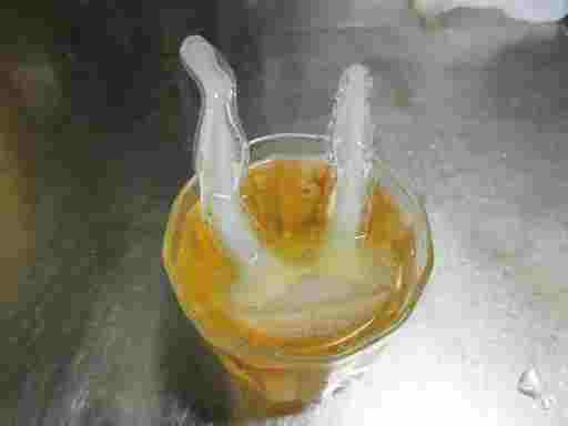 正直言いますと、複雑なギミックでして、もっとシンプルにできないのかなと思いきや、あのシーンを忠実に再現するための試行錯誤の結果なんだそうです。しかしながら、シリコンが柔らかいので、シリコンにちょっとでも圧力をかけたりやねじれを入れたりすると、氷が割れちゃいます。この点は改良が必要ですね。 ちょっと足首がもげてしまいましたが、ウィスキーに浮かべてみました。どうですか、こ、こ、恐わ〜。